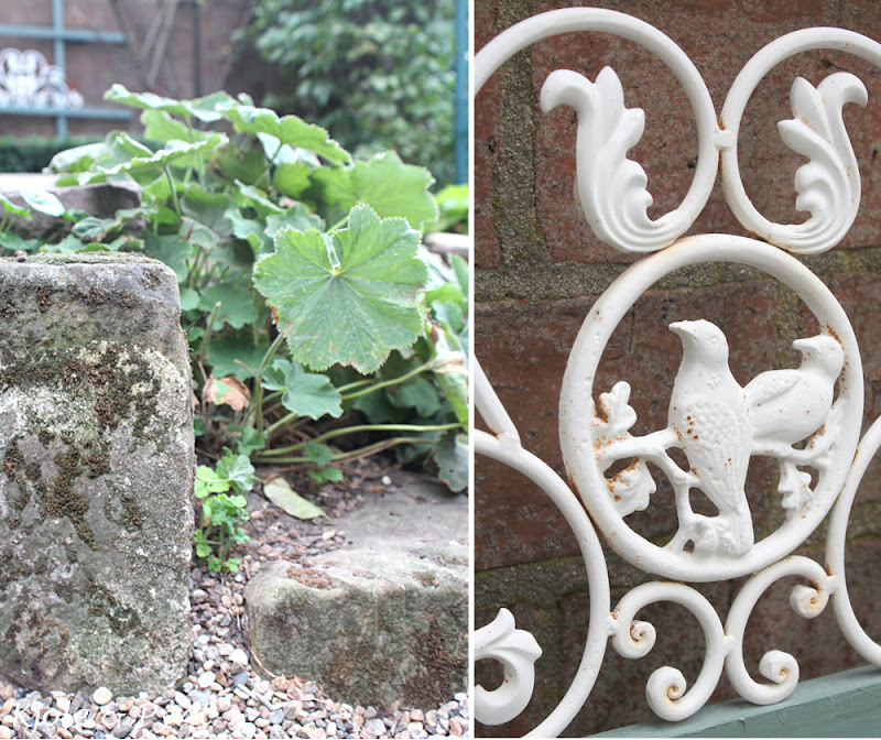 In unserem kleinen Wasserbecken auf dem Hof wuchert und blüht zartlila Wasserminze, die rosa " Fette Henne ", die mir meine Mutter geschenkt hat, biegt sich üppig blühend über den Weg zum Buchsgarten und meine neue weiße Clematis habe ich endlich an den Rosenbogen gepflanzt.