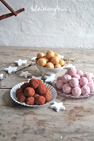 Aus dieser Kategorie habe ich mir die Marzipankartoffelvarianten ausgesucht. Sind sie nicht zauberhaft ? Klassisch mit Kakao & Zimt, fruchtig mit Himbeerpuder und Cranberryfüllung oder meine Variante mit Goldpuder und einer Füllung aus Ingwer (spektakulär oder ?)